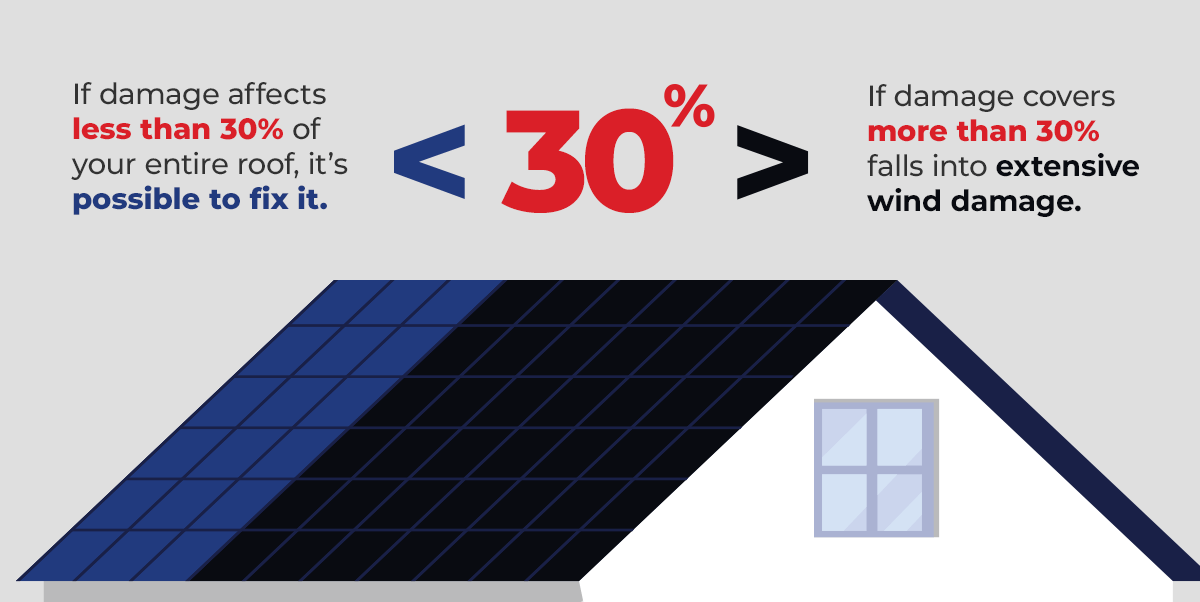 If you find wind damage that covers more than 30% of your roof, this usually falls into extensive wind damage. At this point, it’s more cost-effective to replace the entire roof rather than repair part of it. On the other hand, if you have localized wind damage that affects less than 30% of your entire roof, it’s possible to fix it.