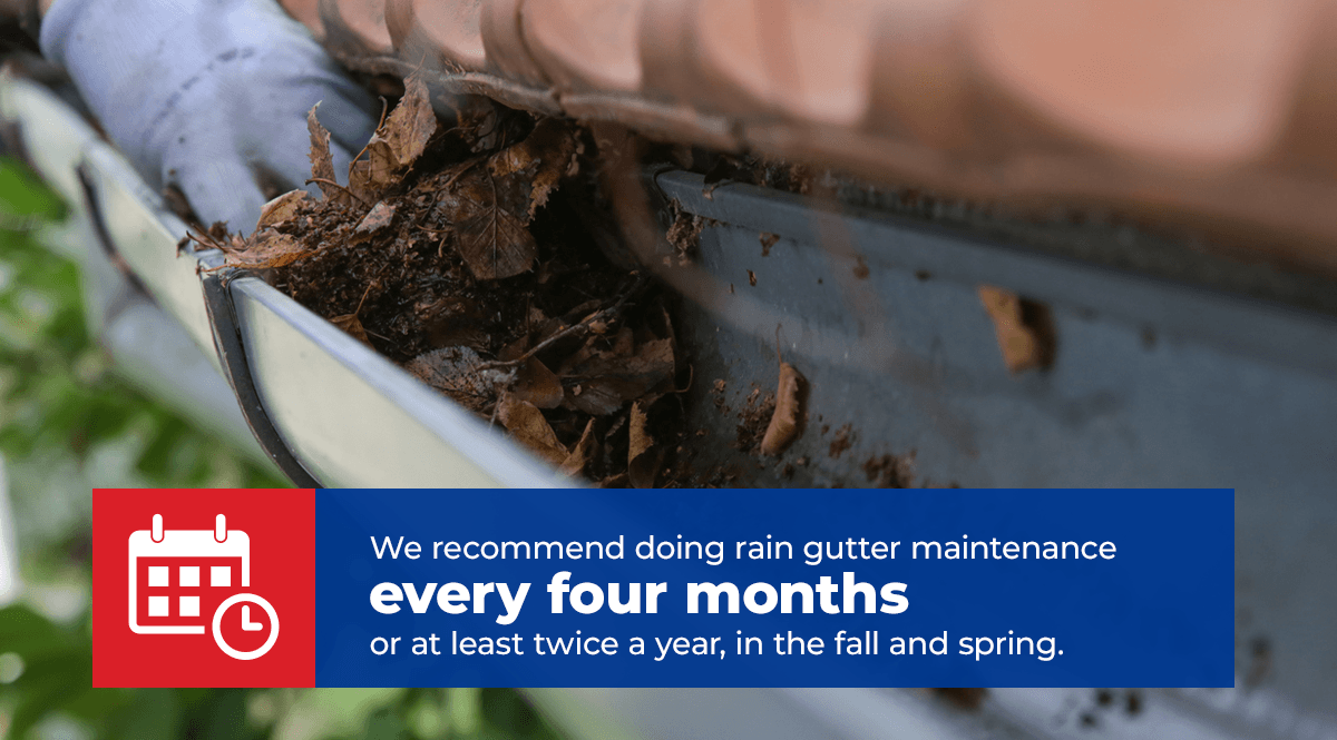 We recommend doing rain gutter maintenance every four months or at least twice a year, in the fall and spring. You can also use your judgment on how often to clean your gutters based on how frequently leaves fall in your area and the tree species growing in your yard. Before and after heavy rains, winds or snowfall, it’s a good idea to visually inspect your home’s gutters. If you see a buildup of foliage, twigs, berries and other outdoor refuse, use a garden hose to flush out the debris that’s blocking the free flow of water. These are our essential tips to make your roof gutter cleaning easier and more effective.
